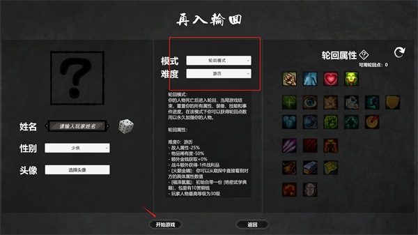 如果你选择轮回模式,你将会体验到全部游戏内容,从一次次的轮回中重新开始,积累实力,强化自身,做出不同的选择,面对不同的敌人,每一次开始都是全新的!