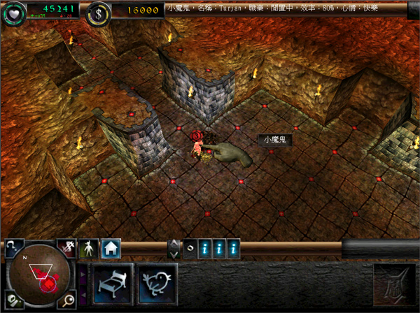 1、游戏开始时,玩家的地下城只有一间房间,房间里有一个金色闪耀的球体,这就是地下城的心脏,是你的力量源泉。一旦它被摧毁,你就得New Game了。和《地下城守护者》一样,小魔鬼仍是你的主要劳动力,负责替你开采金矿,修筑城池,寻找时空转移门等等,小魔鬼们只是进行开发领土,采集金矿,挖掘道路,加固城墙等工作,甚至在战斗过程中还能运送伤员和战俘,即便你不指派它们去工作,它们也会自己加固地下城的城墙,但是小魔鬼并不负责修造建筑物,建筑物的修造过程由电脑自动完成,玩家只需选取相应的建筑在已经开发的地点点击即可,当然首先玩家需要具有修造这种建筑物的能力才行。可以点击未知地区让小魔鬼挖掘出可供通行和修造建筑物的地方来。小魔鬼可以通过购买或者占领传送室后召唤得到,后一种方式是游戏中大部分怪物的主要来源