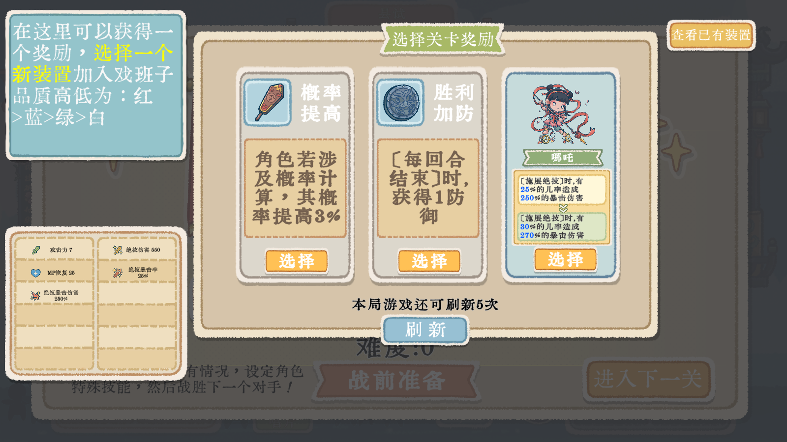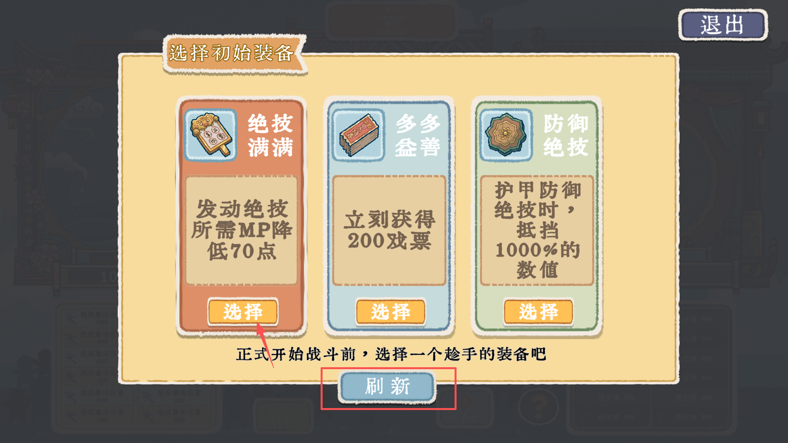7、当击败敌人后,玩家就可以再进行一次“三选一”,并且可以刷新,但需要注意,刷新是有次数限制。