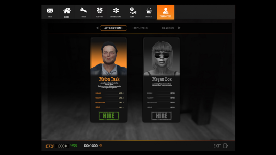 每个员工都有自己独特的数值,不是每个人都注定成为一个收银员,或者在车库里修理引擎。如同之前提到的,你可以在潜在雇员的简历中看到他们的技能。此外,一旦你确定了雇佣人员并开始工作,你需要格外小心。工作一天之后大家都会感到疲劳,尤其是你的工作还在沙漠中。设置合理的工作时间,非必要的话就不要设置加班,付给你的雇员合理的薪水,这些都是必不可少的。随着时间的推移,他们的技能会发生变化,因此留意他们的进步,并且在雇员表现达到你的期望的时候,做出正确的决定。