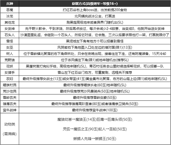 3、特殊兵种——大雪山-冰龙,打一个冰法,操作有自信的话15,6级就可以去了。 黑崖地牢不停sl,有机会出另外的龙。 红石城矿场上边,有一个裂缝,200食物进去打一个boss,会给你恶魔。