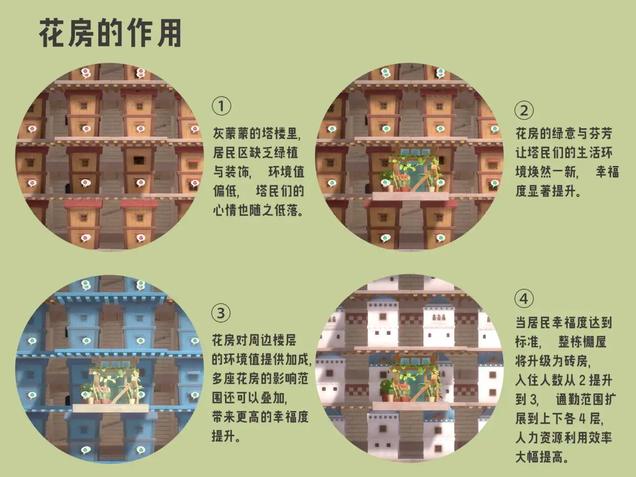 花房正是提升环境值的核心建筑:它不仅能让居民的幸福度快速提升,还能通过巧妙布局,让多个花房的环境值效果叠加,最大化收益。