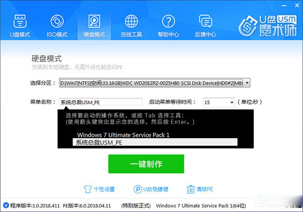 5、"本地硬盘模式"更方便的使用USM,不需要额外的U盘或光盘,直接自动写入本机硬盘方便启动维护。
