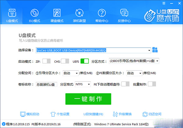 3、"ISO模式"可以单独生成USM的ISO版,方便刻录光盘或者量产U盘使用;也可以一键直接写入U盘。