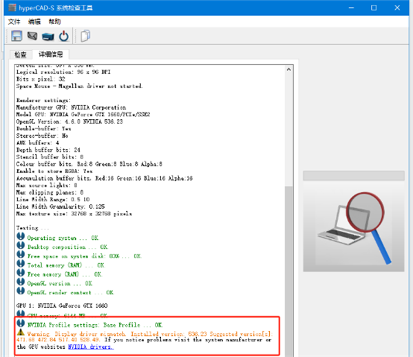 9、关闭后系统自动弹出系统检测页面。如有红色X子的就是不能正常使用,和软件和加密狗 没任何关系,请自行去下对应的显卡驱动,叹号的忽略;