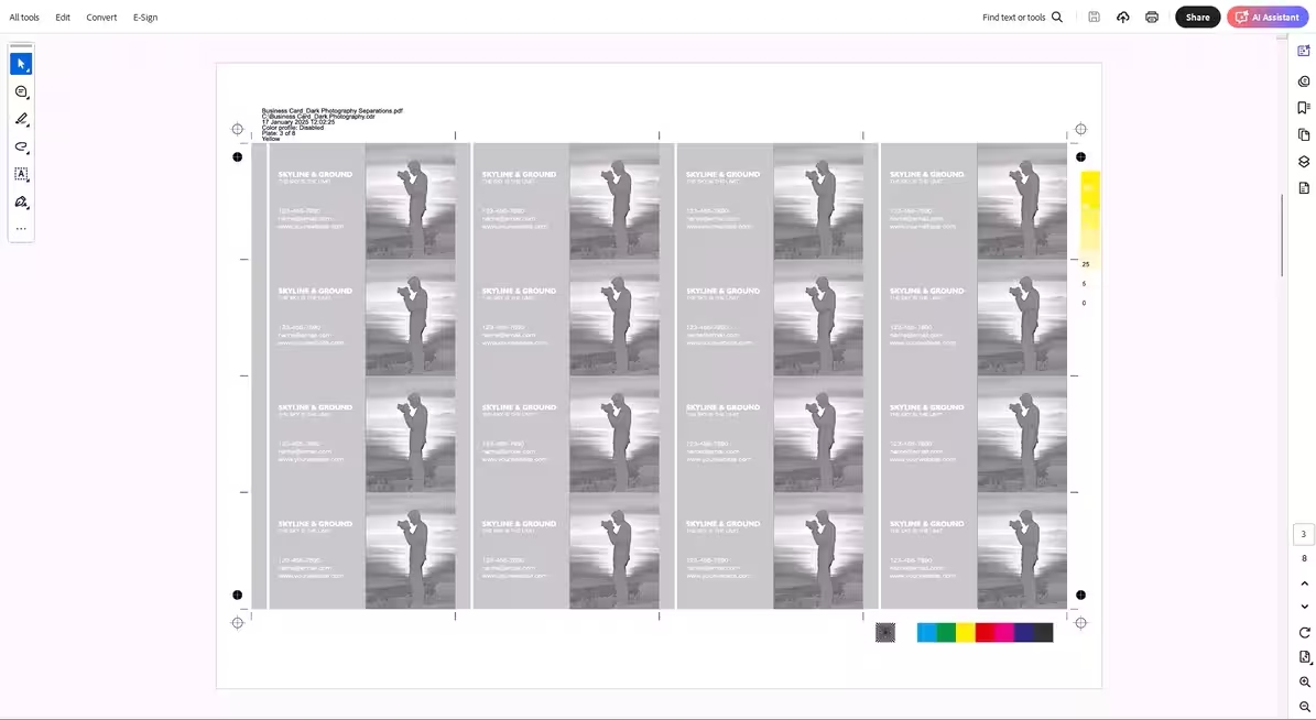 生成的 PDF 包含每个印版的单独页面,其中包含两面的 CMYK 打印数据以及所有标记和文件信息。