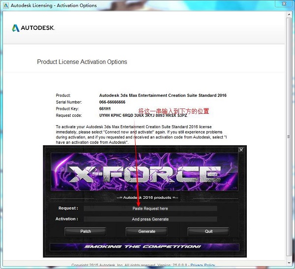 4、将软件的注册窗口中的“request code”复制到注册机中的“请求码”中