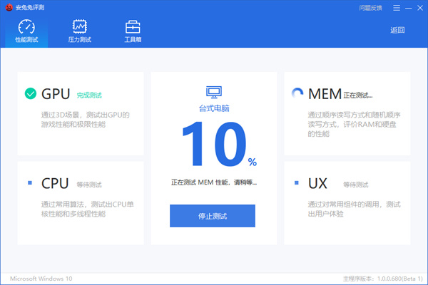 中间“10%”是代表测试进度,达到“100%”就代表测试结束,也可以中途停止测试,点击中间的按钮即可。