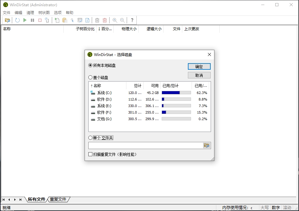 3、目录树模式中也带有多种统计方式,分析过后,你可以看到每个文件夹的体积、文件夹下带有多少文件、以及每个文件夹占用空间的百分比。