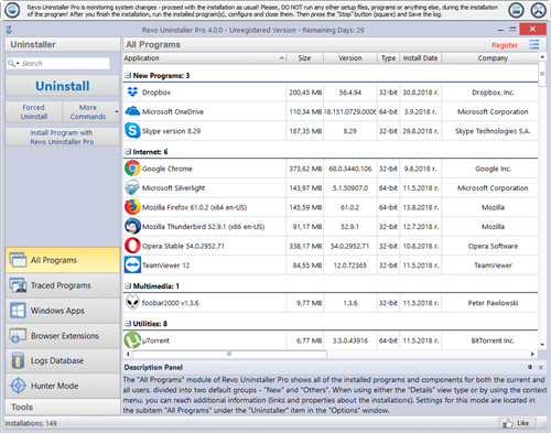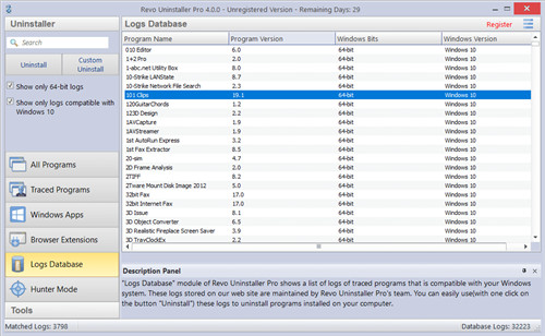 此功能基于Revo Uninstaller Pro自己的实时监控器并派生自此,使其在市场上也独树一帜,日志数据库是我们团队使用上述实时监视功能创建和维护的许多不同程序的大量日志集合,这些日志存储在我们的服务器上,这意味着即使您刚刚安装了,也尚未跟踪任何程序的安装,您都可以在需要时访问它们,您可以轻松地(只需单击一下)卸载程序,或者利用日志数据库中的日志更好地完成卸载,从而删除已经卸载的程序的剩余部分