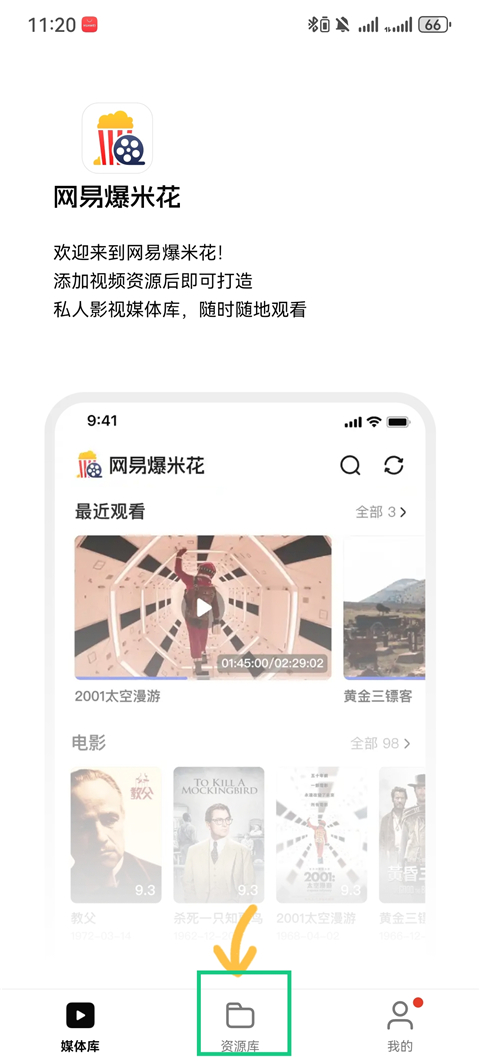 点击前往下载网易爆米花手机端,打开后,点击【资源库】。