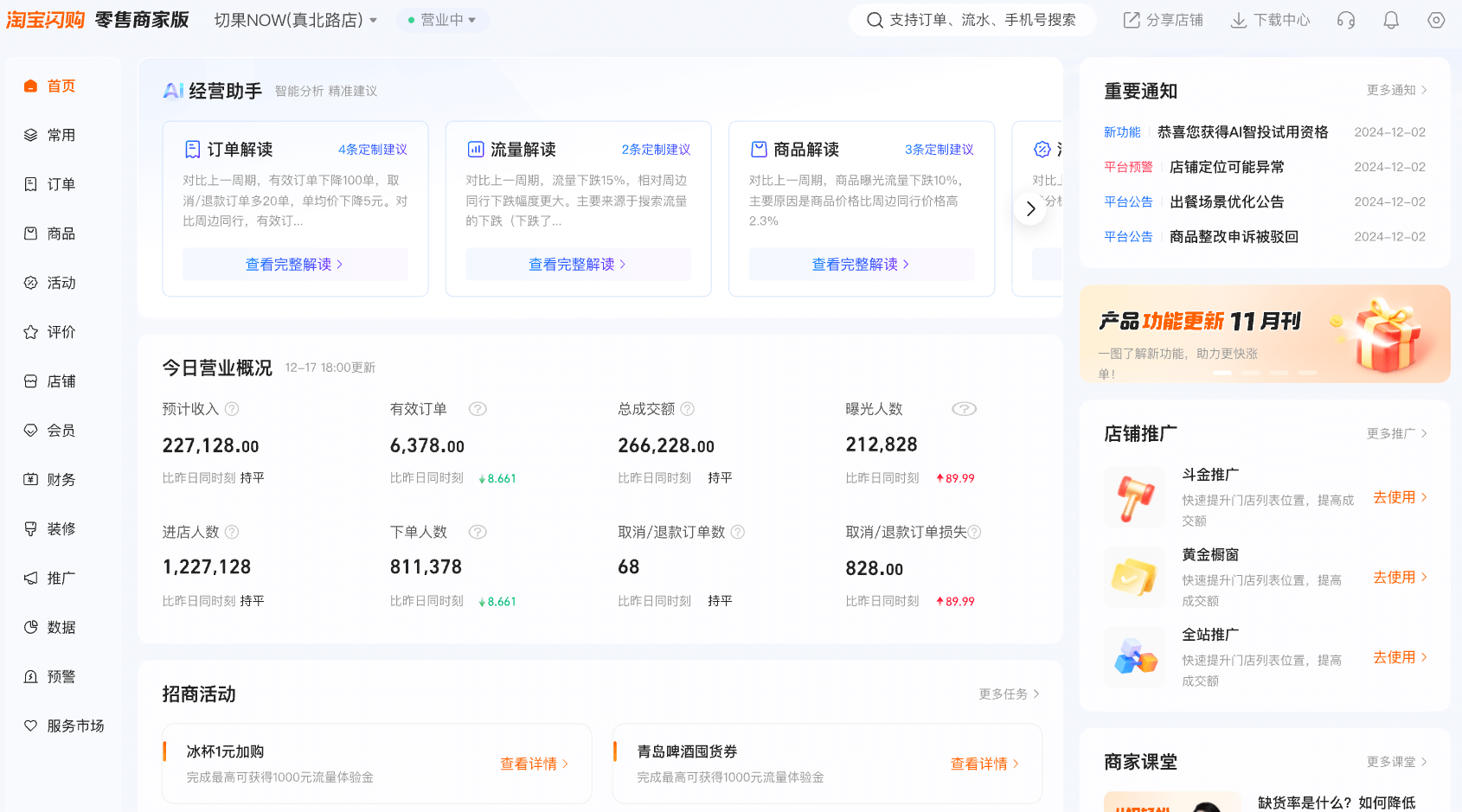 根据您所经营的店铺情况,提供提升门店基建水平及收入能力为目标的经营建议,助力商家实现经营能力进阶;
