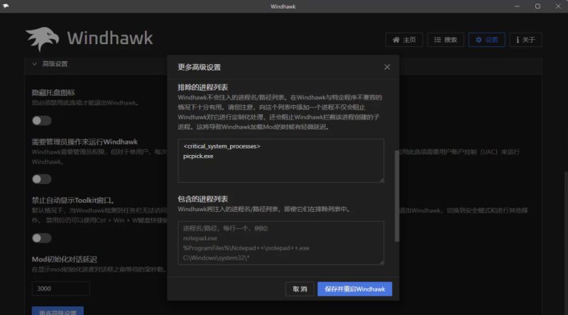 Windhawk 是通过全局 hook 注入的方式来实现相关功能魔改的,所以有可能跟部分软件相冲突。就好像我一直使用的截图工具 PicPick,开启 Windhawk 后它就无法正常使用了,这个时候我们只需要将 PicPick 加入到排除列表中就可以了。具体路径是设置——高级设置——更多高级设置——排除的进程列表。