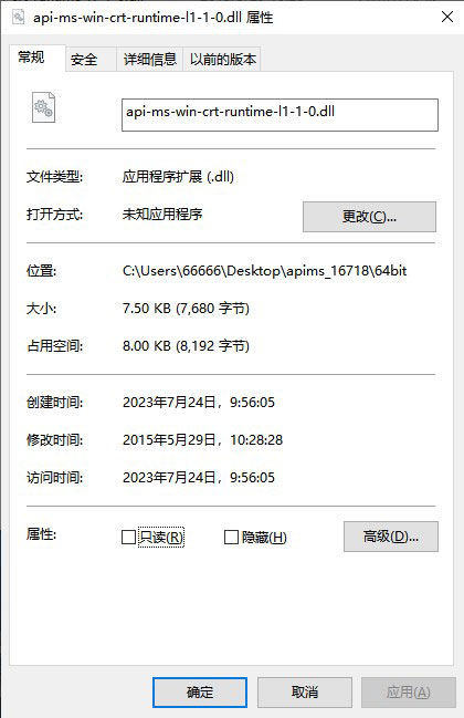 一、下载本站提供的数据包,然后解压得到api-ms-win-crt-runtime-l1-1-0.dll文件,注意有32和64 两个版本。
