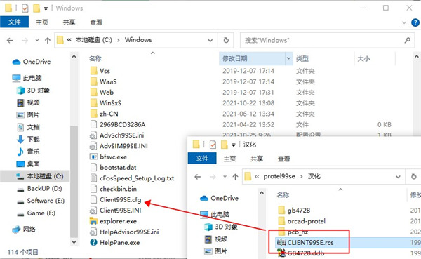 7、接下来对软件进行汉化,将汉化文件夹中的“CLIENT99SE.rcs”文件复制到“C:\Windows”目录下;