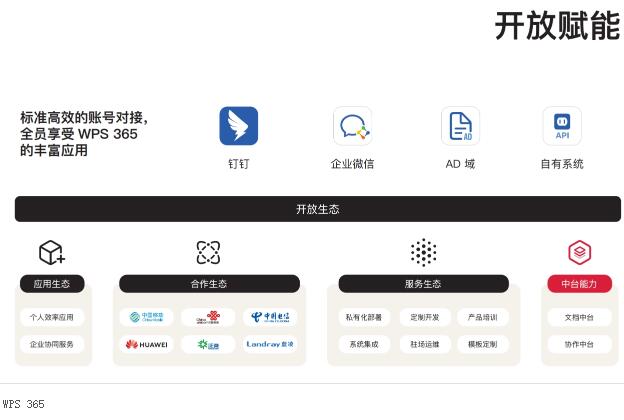 在开放生态方面,WPS 365提供了应用生态、服务生态、合作生态、中台能力等服务,可支持用户同步钉钉、企业微信、AD 域等平台通讯录,并提供多种 API 以连接更多的平台 / 系统。