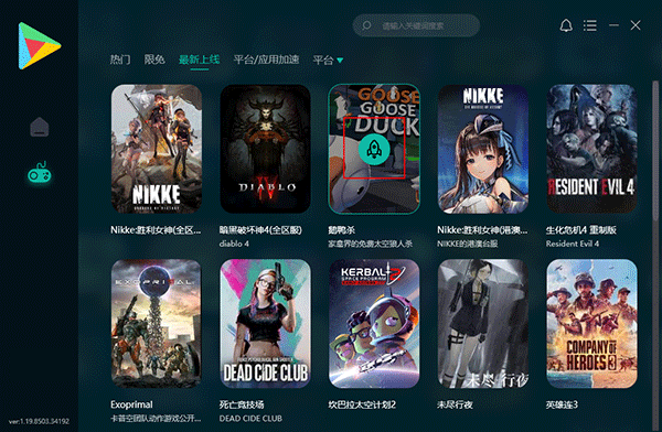 2、进入游戏列表界面,用户可以在上方根据热门、限免、最新上线等分类查找游戏,也可以选择最顶端的搜索框,输入游戏名称进行查找;