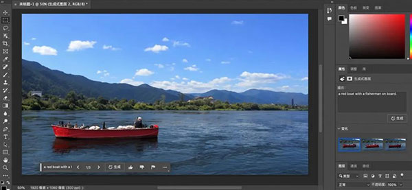 3、天上有些空?只需在天上挂一个热气球、几只飞鸟。三句话,让 Photoshop 帮我画一幅春江垂钓风景图。