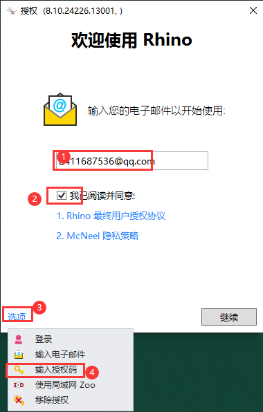 14、将注册机生成的授权码复制到软件界面对应框中,然后点击继续。