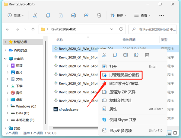2、解压文件后,进入目标文件夹,找到名为【 Revit_2020_G1_Win_64bit_dlm_001_007.sfx 的】安装程序,右键单击该文件并选择以管理员权限运行;