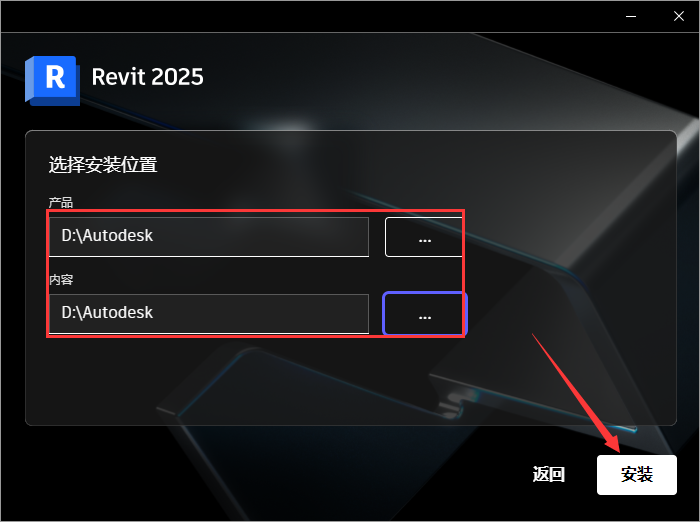 4、选择安装位置,点击…进去更改安装位置(建议将产品和内容2个路径更改一致,然后需要注意的是:更改的位置不能带有中文或特殊符号),然后点击安装。