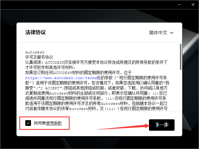 3、软件安装许可协议同意,勾选我同意使用条款,然后下一步。