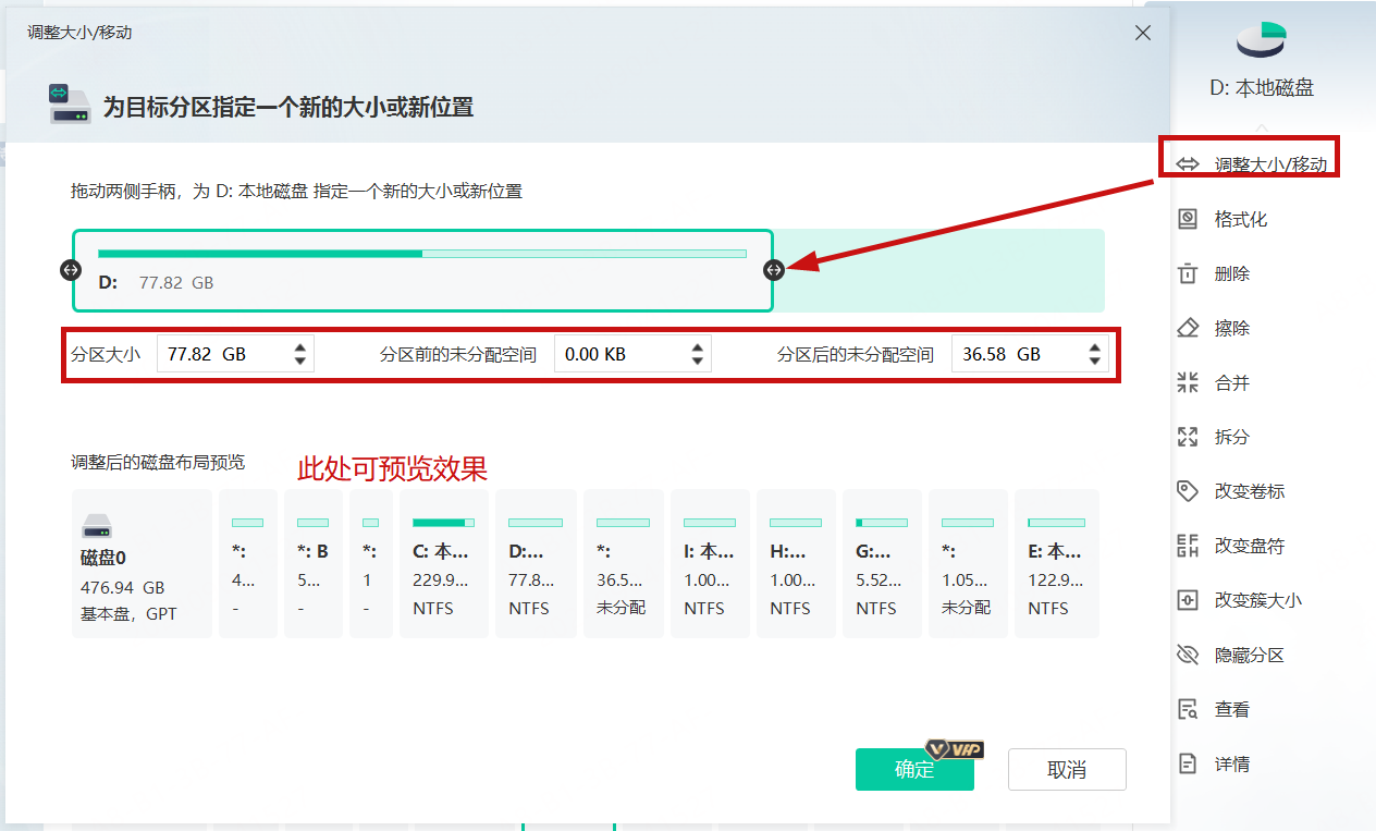 选择一个盘,例如D盘,点击调整大小/移动操作,可拖动分区条调整D盘的空间大小,或者手动设置D盘空间的大小。