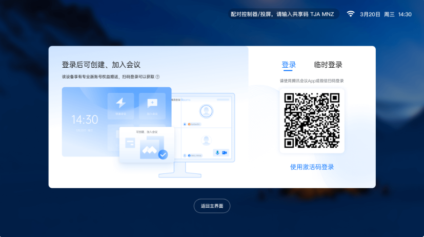 5、选择【登录】后,可使用腾讯会议App或微信进行扫码登录,扫码后可创建一间Rooms 会议室,如您已有会议室可选择已创建的会议室进行登录。
