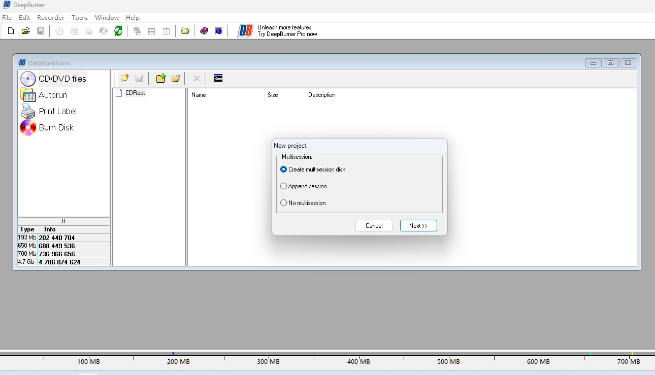 2、以创建cd为例,点击next,点击第一个新建项目多会话-创建多会话磁盘。