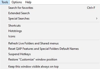 在……里工具菜单,搜索对于收藏夹,在特殊搜索搜索所有收藏夹或断开的收藏夹,管理您的所有快捷指令, 热弦或者核标准情报中心,更新实时文件夹和共享菜单或者暂停QAP热键。