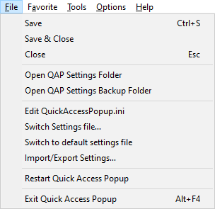 在……里文件菜单,保存您的更改,管理您的QAP设置文件QuickAccessPopup.ini或者离开QAP。