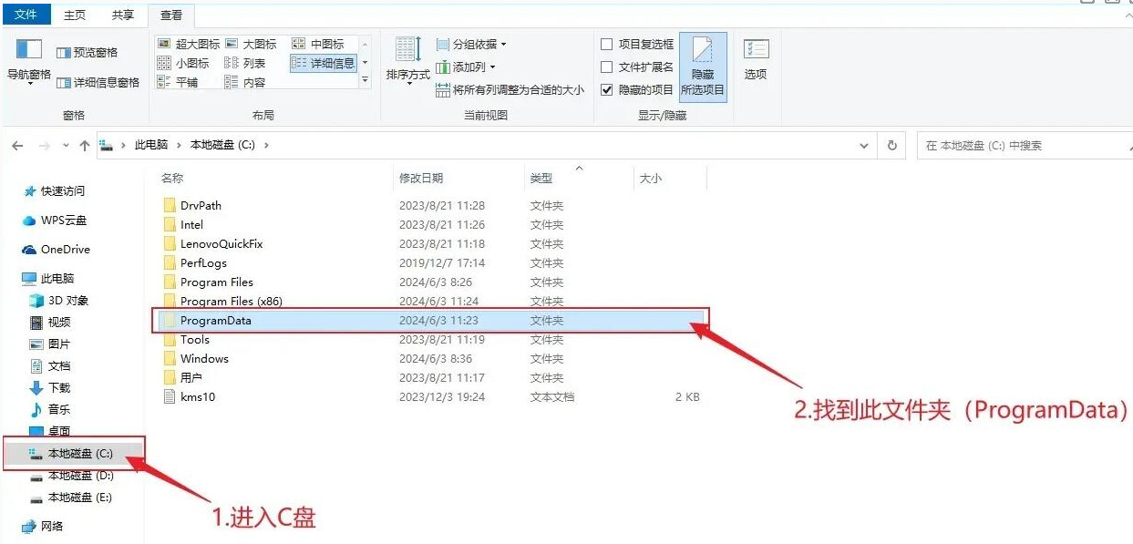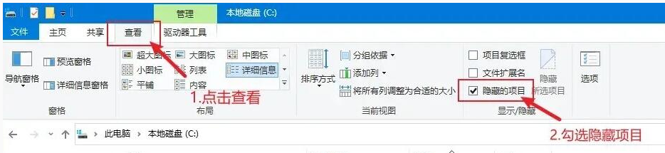 1、为了确保一步到位,打开C盘优先点击查看,然后选择勾选隐藏项目