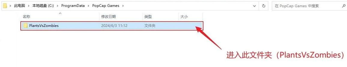 3、找到PopCap Games 文件夹,打开进入找到Plants VSZombies文件夹