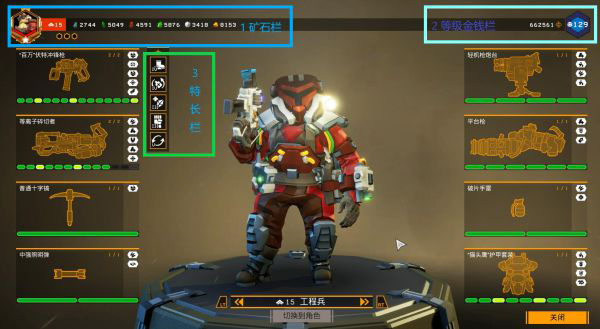 1、打开角色装备:可以看到上面的矿石栏,上面显示的是你现在拥有的矿石(矿石用于升级装备和购买外观),如果你升级装备缺少某些矿石的时候,你可以在以前介绍的矿石购买机器上面购买(当然不建议这样做)。现在你可以在任务机器上面看到你现在能进入的地图(地图全部开放的,只是任务开放部分),在地图上面可以看到盛产矿石,这样针对去进行任务。