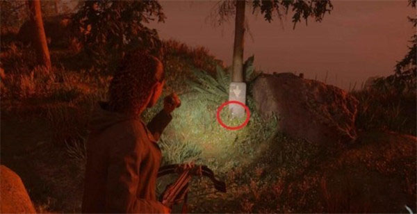 4、想要开启这个藏匿物,需要先找到钥匙,只要沿着带有白色箭头的灰色路标走到南边的一棵树下就能找到钥匙。