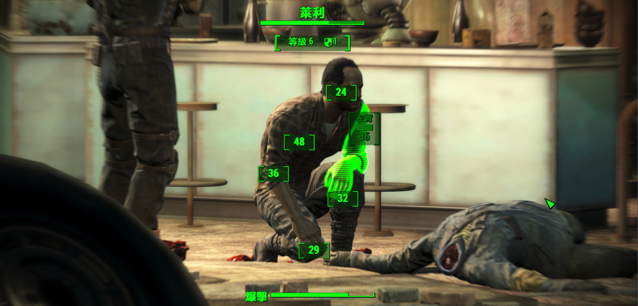 2、开启VATS模式默认是Q键,选定敌人身上的部位是用鼠标左键点击,点击次数由你当前剩余的行动点数决定,武器重量越大且瞄准镜倍率越高则单次攻击消耗的行动点数就越大,取消选定按TAB,退出VATS系统也是按TAB。