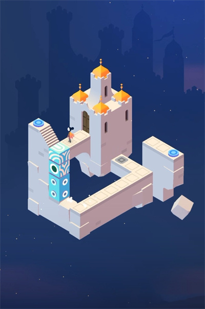2、此时来到第三个场景里,先移动眼睛方柱,到如下图所示的位置,让小人可以去按到前方的蓝色按钮,按完按钮后,建筑开始发生变化,移动方柱去按住另一个蓝色按钮,接着小人站着的柱子会开始上升,大家就来到第四个场景中啦!
