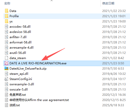 2、在解压好的目录中,找到“DATE A LIVE RIO-REINCARNATION.exe”文件,便可进入游戏了。