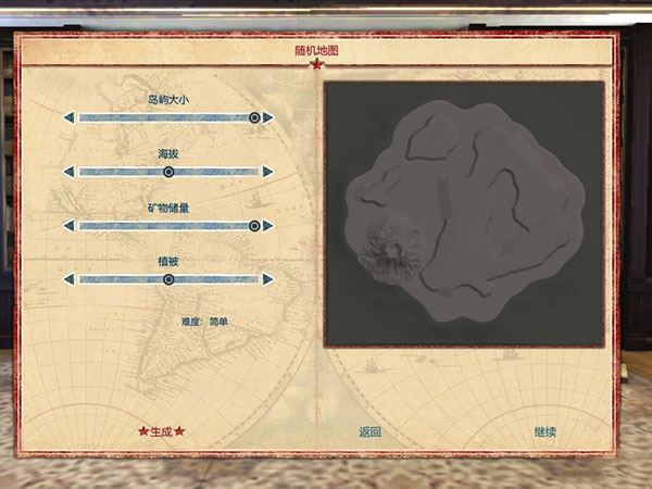 4、然后可以选择地图,如果我们选择随机会出来一些选项,包括岛屿大小、海拔、矿物储量和植被多少。这里要提一下植被的多少会影响湿度,进一步会影响游戏中可种植的农作物。
