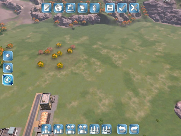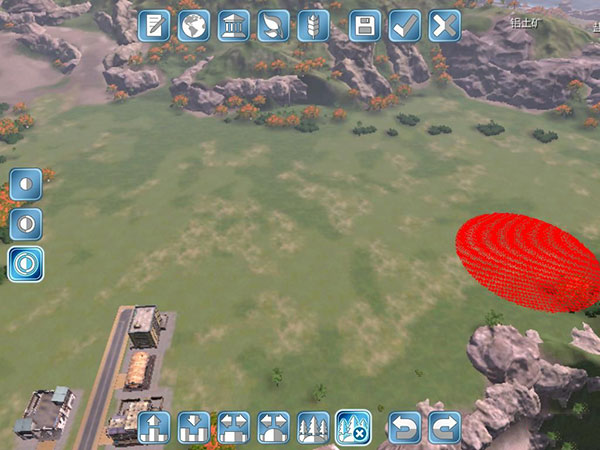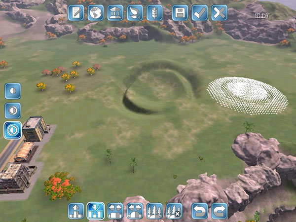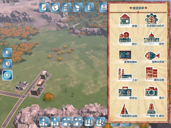 6、点选继续后,我们就进入编辑器了。首先我们来看一下界面:最上方第一二的按钮由于汉化组申明了汉化版不支持其功能,英文原版可以,我们就先不管它们,先点开第三个按钮:特殊建筑。