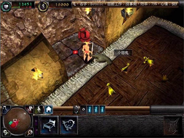 1、游戏开始时,玩家的地下城只有一间房间,房间里有一个金色闪耀的球体,这就是地下城的心脏,是你的力量源泉。一旦它被摧毁,你就得New Game了。和《地下城守护者》一样,小魔鬼仍是你的主要劳动力,负责替你开采金矿,修筑城池,寻找时空转移门等等,小魔鬼们只是进行开发领土,采集金矿,挖掘道路,加固城墙等工作,甚至在战斗过程中还能运送伤员和战俘,即便你不指派它们去工作,它们也会自己加固地下城的城墙,但是小魔鬼并不负责修造建筑物,建筑物的修造过程由电脑自动完成,玩家只需选取相应的建筑在已经开发的地点点击即可,当然首先玩家需要具有修造这种建筑物的能力才行。可以点击未知地区让小魔鬼挖掘出可供通行和修造建筑物的地方来。小魔鬼可以通过购买或者占领传送室后召唤得到,后一种方式是游戏中大部分怪物的主要来源