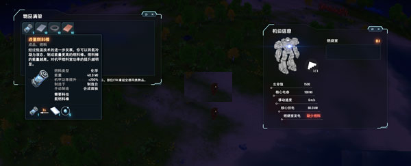 C键,机体面板,能看到机器人基本的数据,机器人行动时会不断消耗能量,把燃料拖进燃烧室,来产生更多的能量。一开始可以采集木头、植物、煤矿来获得燃料。