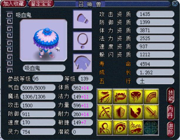 作为多技能召唤兽的鼻祖,吸血鬼以其在无名鬼域大量出没、必带三个技能、先天拥有夜战、吸血、偷袭技能、出现时间早等优势赢得了所有95级以上玩家的青睐,甚至曾登上武神坛这样的高端赛事。尽管现在涌现了很多新召唤兽,但是吸血鬼在梦幻中仍然拥有很高的地位。