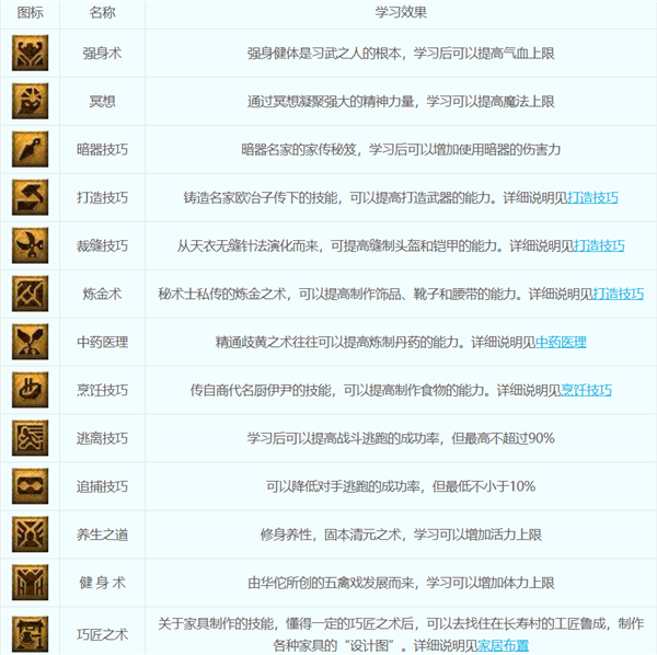 生活类的辅助技能不含法术,但是学习后可以得到相应的辅助效果,比如学习“打造技巧”可以提高自己打造装备的能力,学习“中药医理”可以提高炼药的能力等等。