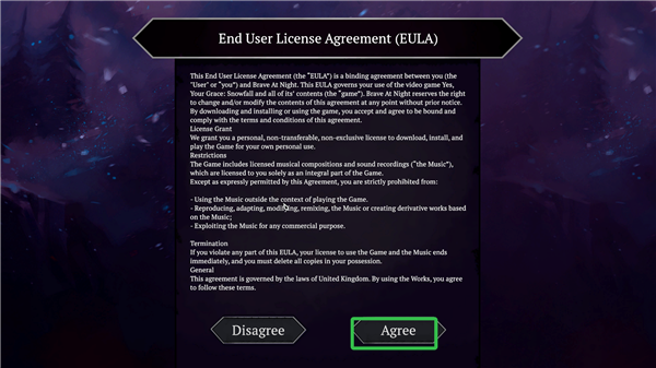 1、进入游戏按下任意键后,出现一下画面,点击Agree同意。