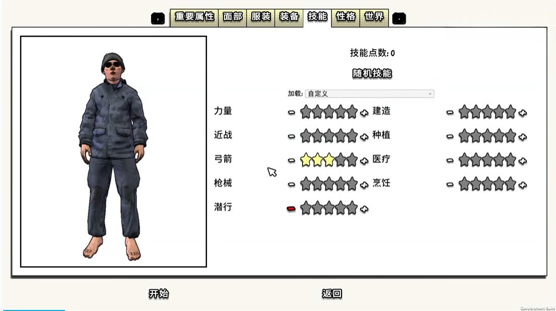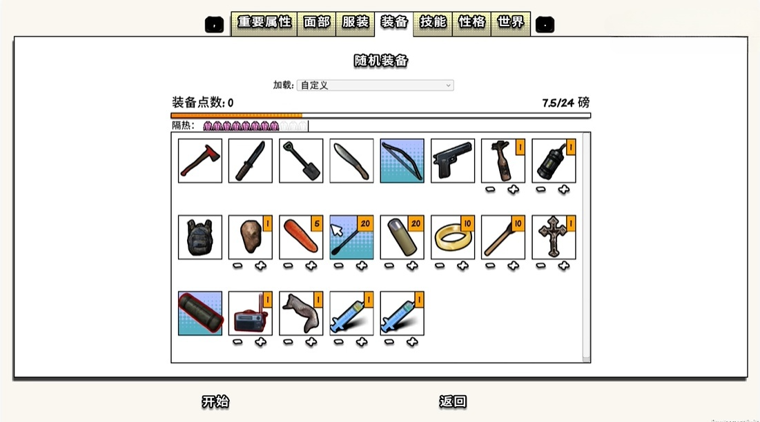 新手开局我给出的建议是1点力量1点近战2点弓箭1点枪械,物品推荐选择斧头,睡袋。