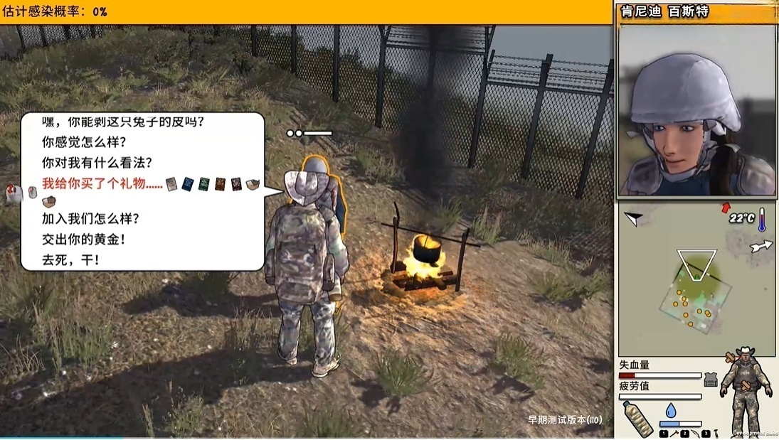 失血量:就是人物的血量,受伤之后不打绷带或者破布会持续失血直到死亡。回血速度和被治疗时的医疗等级相关,当人物的手臂,腿部等位置受伤时,大概率会影响当前人物技能水平。力量,近战等能力会暂时下降,直至伤口痊愈,睡眠的时候恢复速度会略有增加。