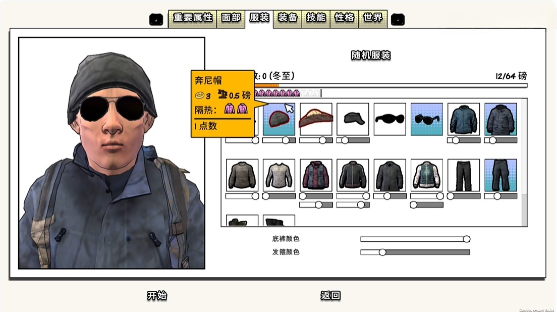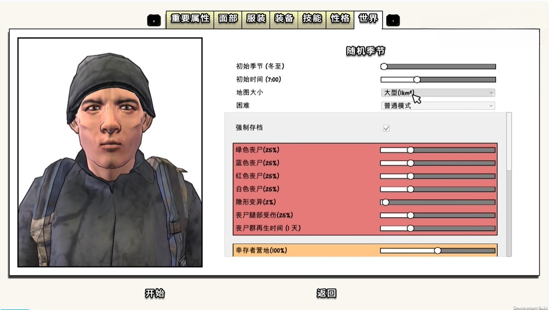 6、世界选项:这里可以调节游戏难度等,强烈建议新手使用简单难度,并选择春至开局(天气不冷)。简单难度不会有隐形异变,丧尸一半断腿。对于新人非常友好。在新人时期不建议大家调整游戏内的其他参数,等对游戏有进一步了解后再进行更改。