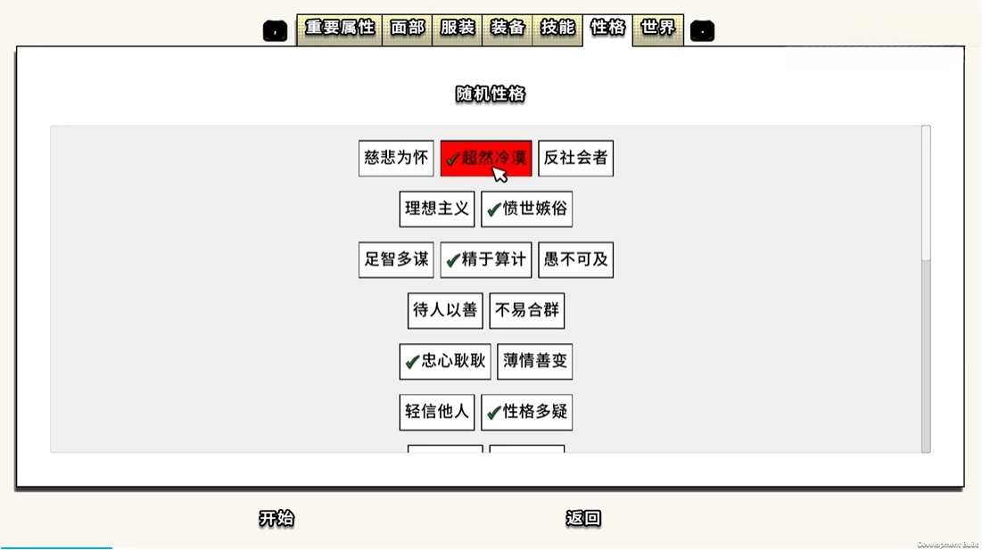 5、性格会影响人物在闲置过程时的自主行为,以及人物之间的对话。但主角在**控的时候不会被性格影响行为,只会影响对话,在性格的影响下一些对话的选项将无法选择。如果角色拥有慈悲为怀+待人以善,那么正常情况下是无法伤害非敌对的人的,但是主角则不会收到此影响。总体而言,角色性格不要选择太过于友善,也不要过于偏激,一看就是贬义词的,什么其貌不扬呆气十足就没必要选。