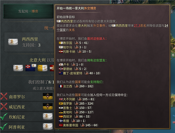 9、唯一拥有领导权的国家可以发动统一的外交博弈,博弈会对符合文化的所有国家开战。但有国家支持你成立,则会作为盟友加入战争(虽然是盟友,但经常外交博弈一开始就全跑光了)。统一战争如果胜利,则会吞并所有国家,但并不会直接成立,还需要在成立国家界面点一下成立。